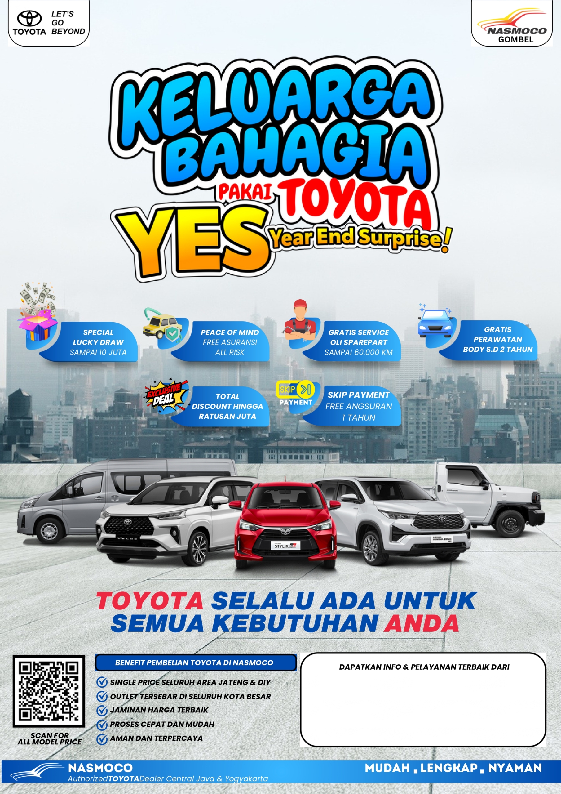 Menutup tahun dengan penuh kebahagiaan kini semakin mudah berkat Program YES – Year End Surprise dari Toyota Nasmoco Pemuda. Promo akhir tahun ini hadir untuk membantu keluarga Indonesia memiliki mobil impian dengan lebih nyaman, hemat, dan penuh keuntungan. Melalui berbagai penawaran spesial, Toyota memastikan setiap pelanggan dapat merasakan pengalaman membeli mobil yang aman, mudah, dan menguntungkan.